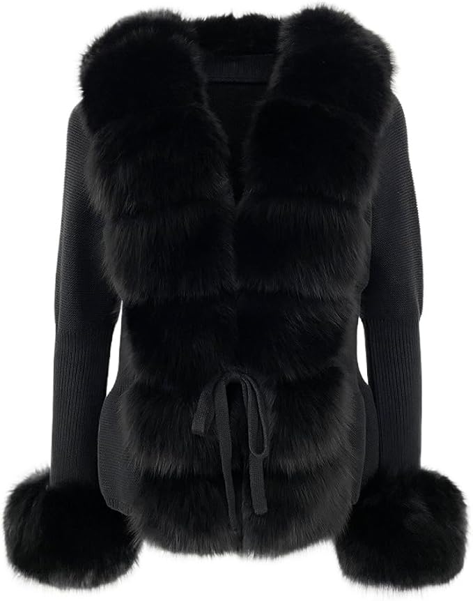 Strick-Cardigan mit breiter Faux-Fur-Blende vorn und Faux-Fur-Manschetten. Hüftlange Passform, Bindegürtel zur Taillenbetonung, elastischer Feinstrick an Rumpf und Ärmeln für Komfort.