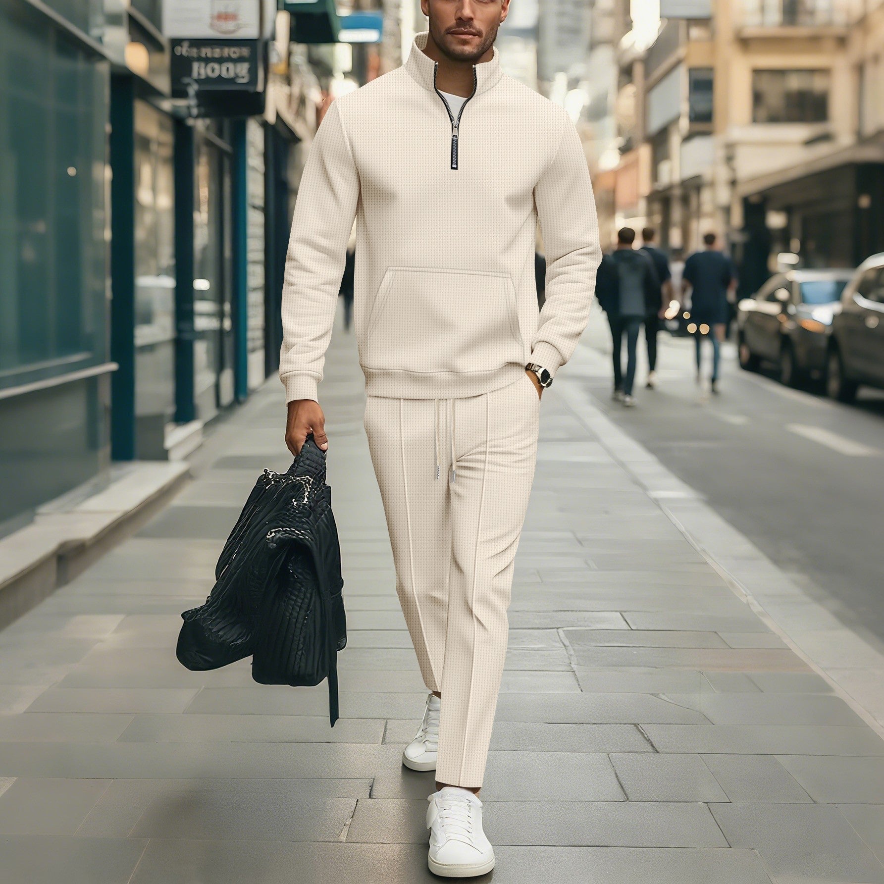 With this modern men's two-piece, you'll be perfectly dressed for fall – whether for the city, leisure, or light sports activities. The set combines a long-sleeved sweatshirt with a stand-up collar and practical half-zip closure, as well as matching trousers in the same fabric design.